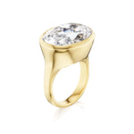 Oval cubic zirconia approx. 13x18mm bezel set east-west in 14k yellow gold. Size 3.5, but can be resized to fit a size 3 or size 4.