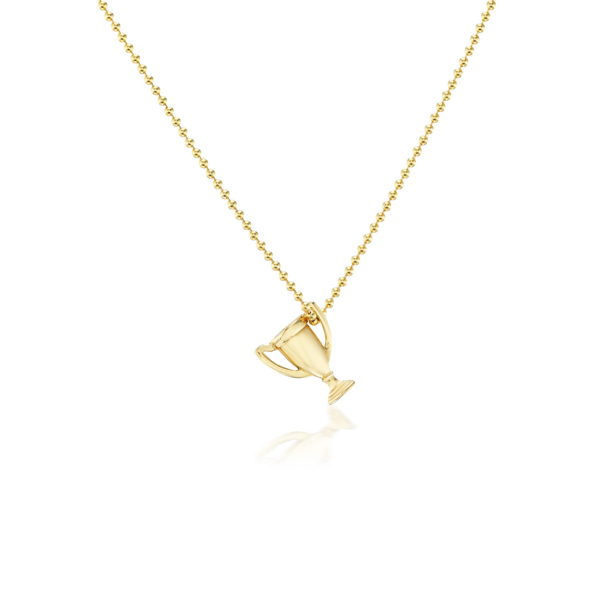 Solid 10k yellow gold or Sterling Silver micro-mini trophy on 20” 14k gold mini ball chain.
