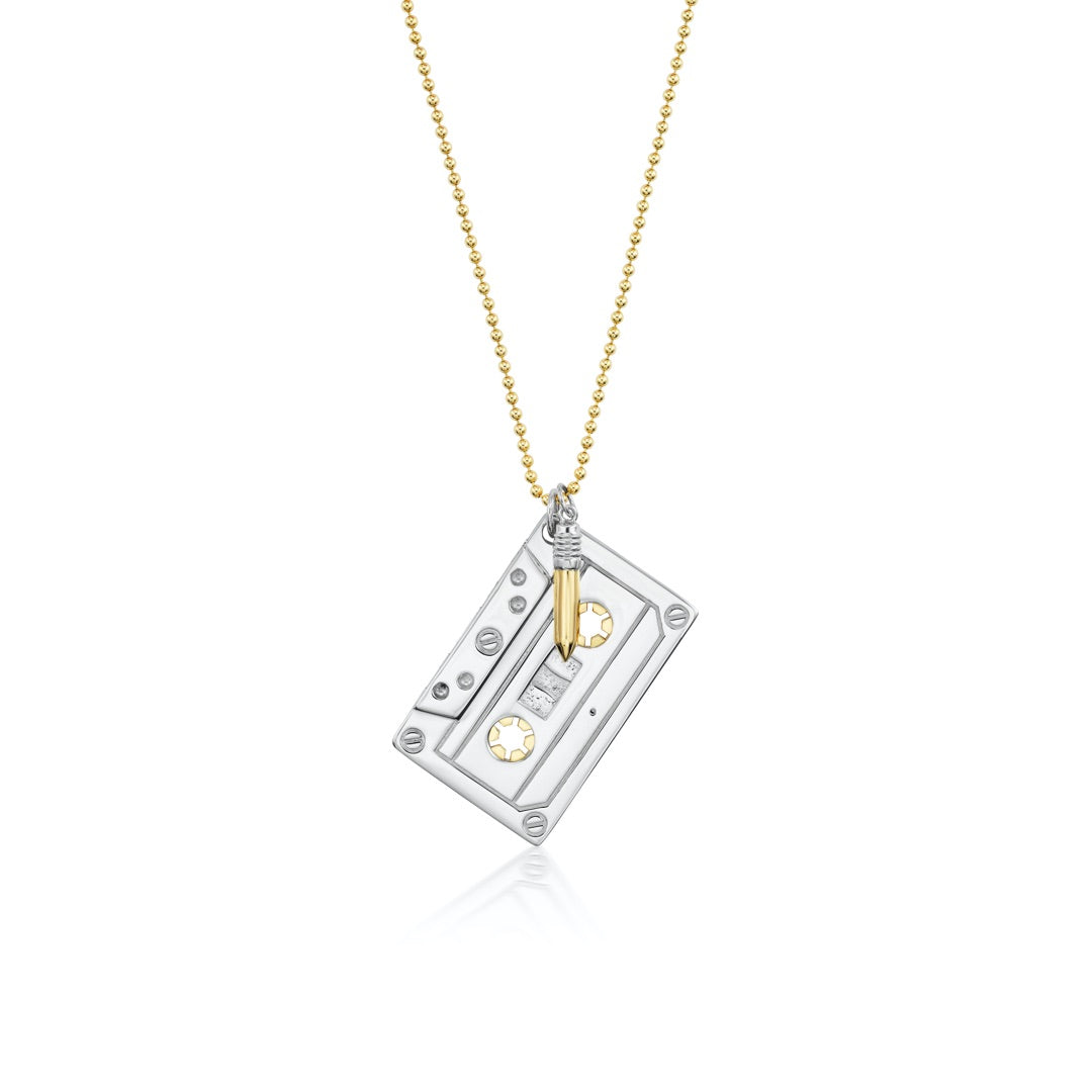 Sterling silver and 10k yellow gold tape cassette with rotating spools and 'Pencil’ pendant set on a 24” 1.5mm 14k yellow gold ball chain.